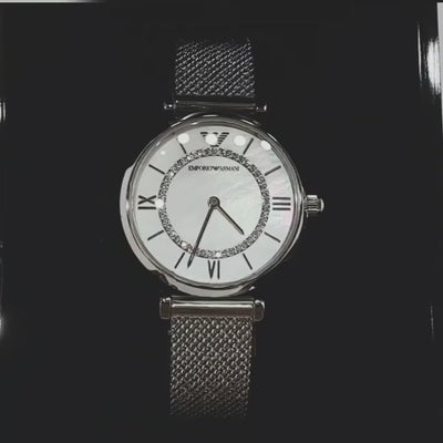 Discover the elegance of the Emporio Armani AR11319 Gianni T-Bar Ladies Watch, a sophisticated timepiece with a silver mesh bracelet, mother-of-pearl dial, and sparkling crystals - a perfect blend of style and functionality.