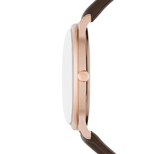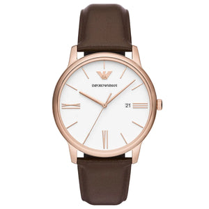 Discover the understated elegance of the Emporio Armani AR11572 men’s watch, featuring a 42 mm rose-gold stainless steel case, a contrasting white dial, and a rich brown genuine leather strap. Equipped with a reliable quartz movement and built for daily wear with 5 ATM water resistance, this timepiece offers both refinement and versatility for the modern man.