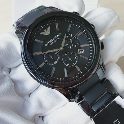 Discover the Emporio Armani AR1451 Renato Ceramica Men's Watch, a sleek all-black timepiece with chronograph functionality and water resistance - the epitome of high-end style and precision engineering.