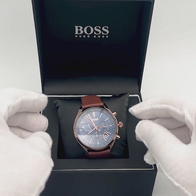 Discover the epitome of elegance and functionality with the Hugo Boss 1513604 Grand Prix Men's Chronograph Watch, featuring a rose gold case, deep blue dial, and genuine brown leather strap - a perfect fusion of style and precision.