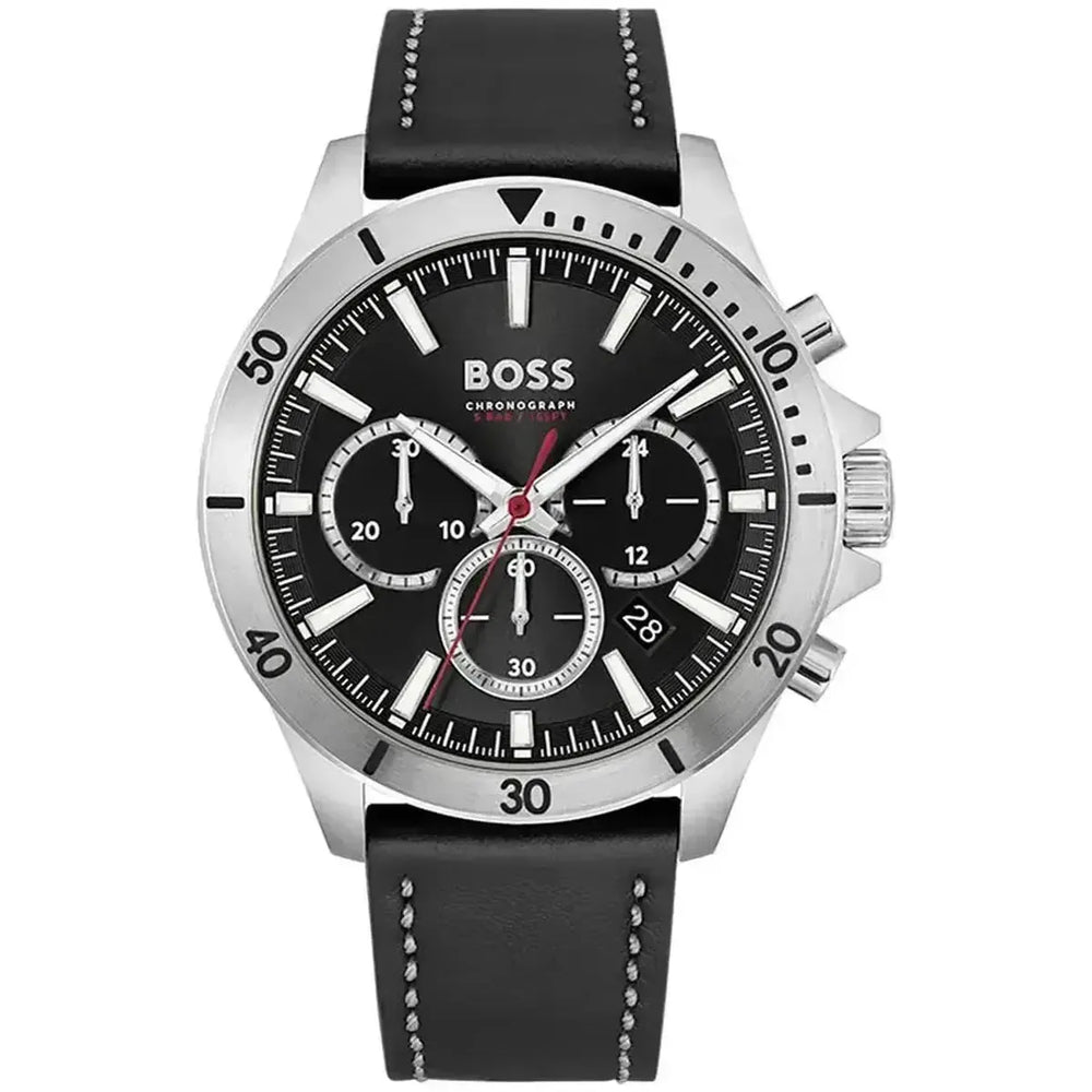 Shop the Hugo Boss Troper 1514055 Men’s Watch – a sleek black chronograph featuring a 44 mm stainless steel case, black sunray dial, black leather strap, and 50 m water resistance.