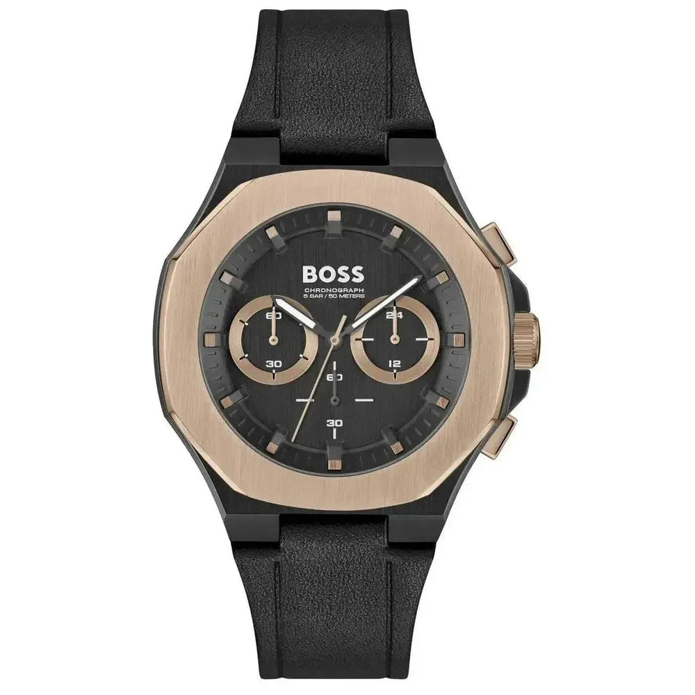 The Hugo Boss 1514089 Tour stands out with its powerful aesthetic — a black sunray dial framed by a stainless steel case enhanced with black ion-plated details. The 44 mm size provides a confident wrist presence, while the chronograph subdials and tachymeter scale offer added practicality and dynamic styling.