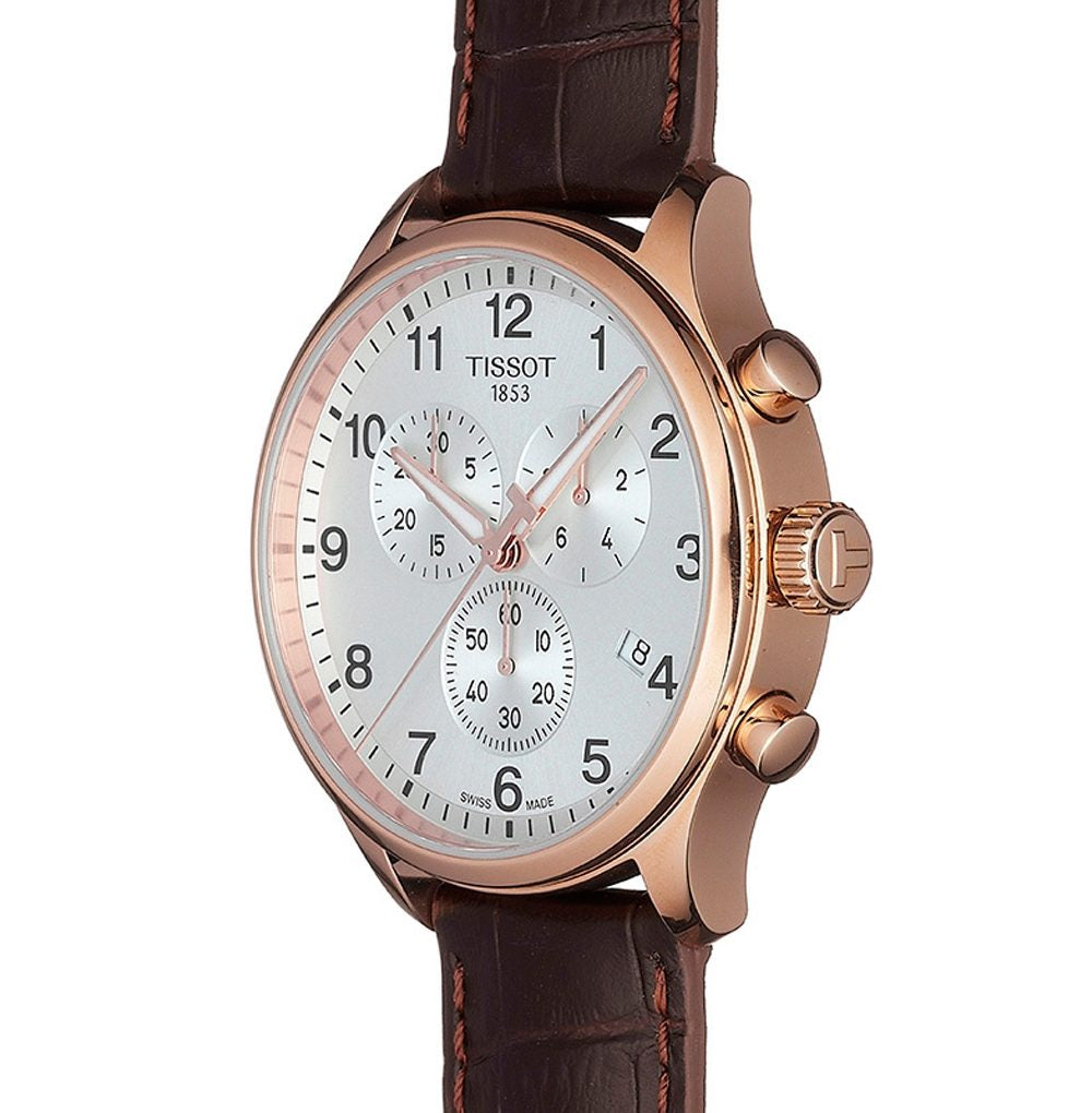 Experience classic Swiss craftsmanship with the Tissot Chrono XL T116.617.36.037.00 — a 45 mm chronograph featuring a silver dial, rose-gold PVD stainless-steel case, brown leather strap and precise Swiss quartz movement built for refined everyday style.