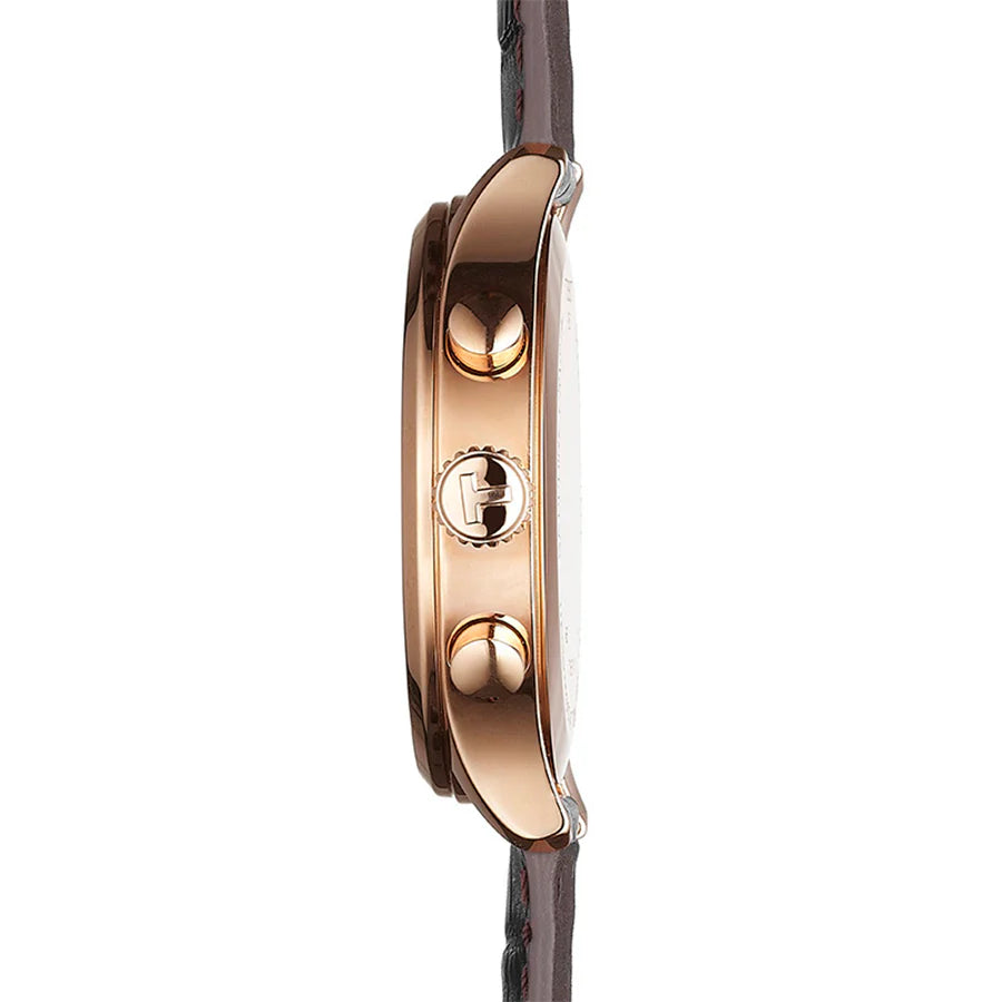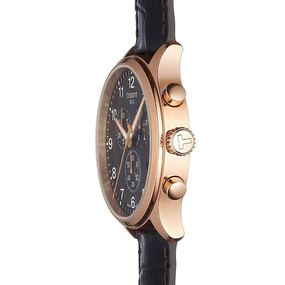 Discover the bold and modern Tissot Chrono XL T116.617.36.057.01 — featuring a 45 mm stainless-steel case with rose-gold PVD finish, black dial, brown leather strap and Swiss quartz chronograph precision built for confident everyday style.