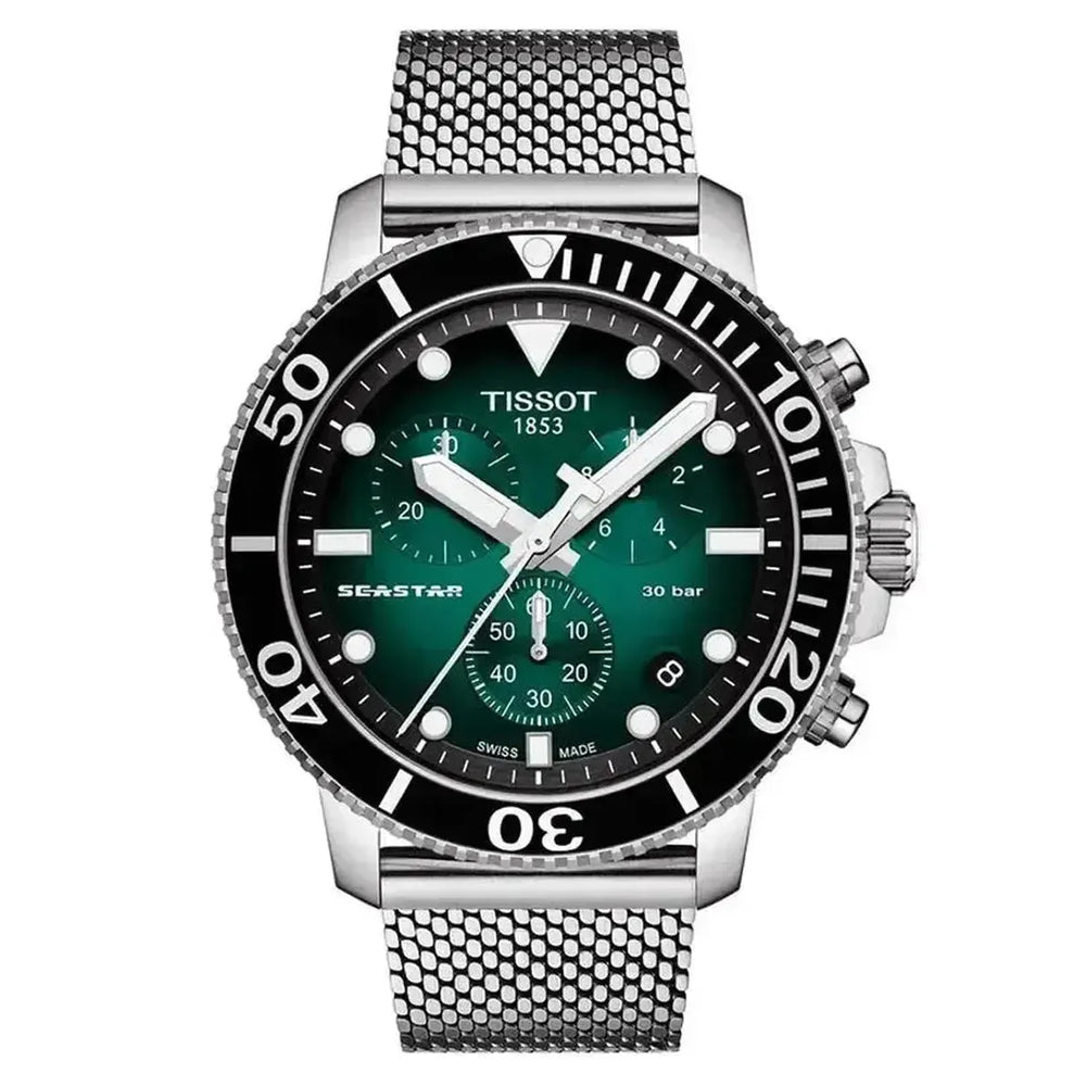 Shop the Tissot Seastar 1000 Chronograph T120.417.11.091.00 Men’s Watch – a robust diver chronograph featuring a 45.5 mm stainless steel case, graded green sunray dial, stainless steel mesh bracelet, and 300 m water resistance.